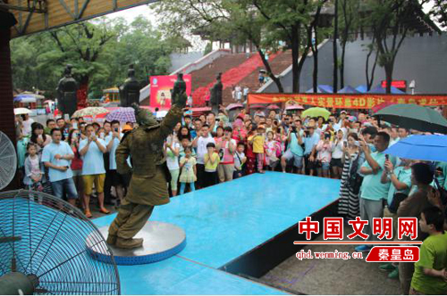 2016年7月7日,記者來到秦皇求仙入海處。在求仙殿廣場(chǎng)的東南方舞臺(tái),伴著富有節(jié)奏感的音樂響起,“泡泡大叔”的街舞表演準(zhǔn)時(shí)開始。他穿著皮質(zhì)的兵馬俑服裝,蹬著黑色軍靴,臉上涂滿灰色油彩。只見他雙腳不動(dòng),雙手舞動(dòng)前伸,身體前傾與地面成45度。固定幾十秒后,身體慢慢復(fù)位站直,又隨著音樂跳起了街舞。大約半個(gè)小時(shí)后,汗如雨下的“泡泡大叔”沖到電扇前吹風(fēng),一口氣喝下2瓶藿香正氣水,又跑回舞臺(tái)繼續(xù)表演。